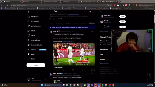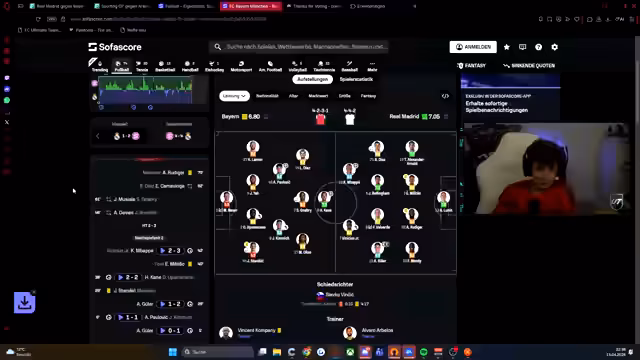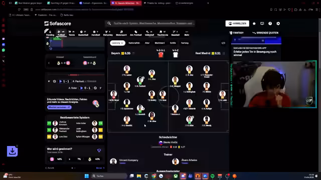 00:00:47Der Stream beginnt mit der Übertragung des Champions-League-Spiels zwischen Bayern München und Real Madrid. Der Kommentator zeigt sich angespannt über die Ausgangssituation und die Aufstellung beider Teams. Besonders die frühe Führung von Real Madrid nach 47 Sekunden sorgt für große Unruhe im Chat. Der Streamer äußert sich kritisch über das Spielgeschehen und die Schiedsrichterentscheidungen, die aus seiner Sicht zu Ungunsten von Bayern ausfallen. Die Eröffnungsphase des Spiels präsentiert sich spannungsreich und emotionsgeladen.