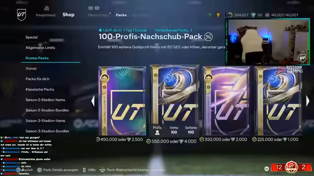 03:50:30Nachdem der Streamer bereits dreimal Totti aus dem Shop-Pack gezogen hat, wird der vierte Zug vorbereitet. Die Glücksserie und die Wahrscheinlichkeit eines vierten Tottis werden als 'zu geisteskrank' beschrieben. Gleichzeitig wird die Machbarkeit eines 89er-Teams bewertet, da der Streamer keine Spieler über 90 im Verein hat. Er entscheidet sich, das Pack erneut zu ziehen, auch wenn dies sein 'Limit' an gezogenen Karten erreicht, und wechselt zuvor auf seinen zweiten Account.