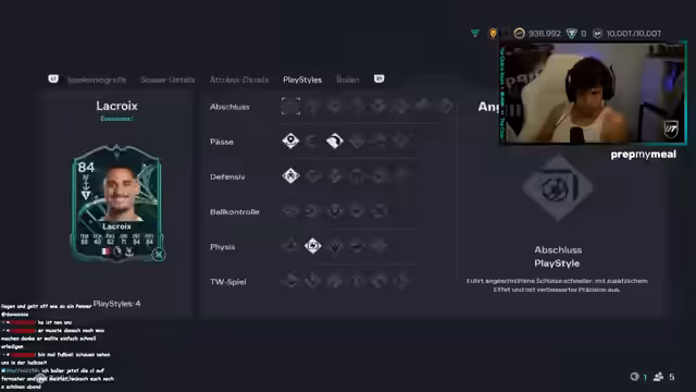 00:06:37Der Streamer geht auf persönliche Themen ein: Studium, Gym und Freunde beanspruchen Zeit, und er kämpft mit einer einwöchigen Krankheit. Dennoch steht das Team im Fokus: Evos wie Tiki-Taka und Abfang werden für Spieler wie Niskas oder Griezmann besprochen. Es folgt eine Diskussion über Taktiken, z. B. ein defensiver Mittelfeldspieler nach Levys Vorbild. Die Suche nach passenden Karten für den LM (Linksmitte) wird thematisiert, wobei fehlende 'coole Karten' kritisiert werden.