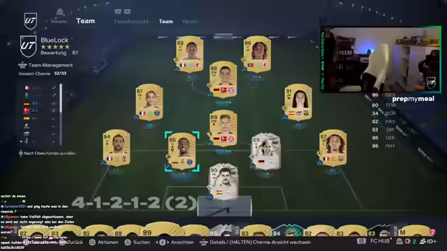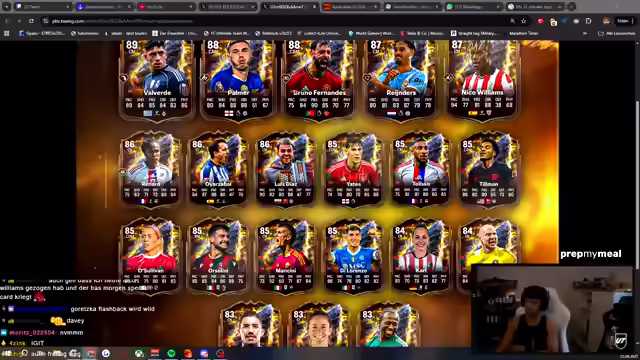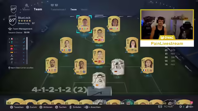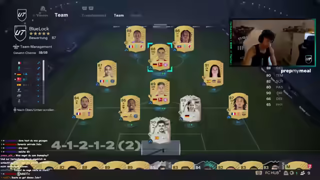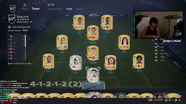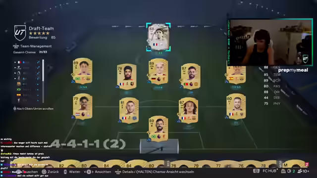 01:41:29Der Streamer startet mit 150 Euro Guthaben für Drafts und 4000 übrigen Points. Er hat bereits Packs angespart, darunter ein Megapack, 52k-Sets und ein 55k-Pack. Es folgt ein Rivals-Spiel, um Pacho zu testen. Er äußert den Wunsch nach Georges, falls er 300k hätte. Im Spiel kritisiert er Schüsse und die hohe Summe von 1,6 Millionen für Drogba. Er hadert mit dem Script und lobt Jones als beste Innenverteidigerkarte. Er plant, nächste Woche mit Nico oder Kyle in Rivals zu spielen, da Solo-Spiele schwierig sind. Er selektiert Spieler ohne Playstation Plus, um Pay-to-Win zu vermeiden. Er spielt gegen Teams mit 6 Millionen Wert und kritisiert Pacho für seine mangelnde Beweglichkeit. Er berichtet von seinen Erfahrungen in Division 3, wo er zwischen Gewinnen und Verlieren wechselte und es ihm nicht wert war. Er erwähnt Chevalier als besten Torwart und dass die Preise für Spieler in der Nacht am günstigsten sind.