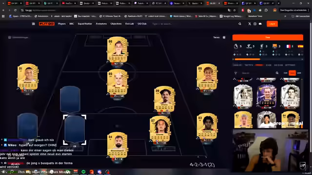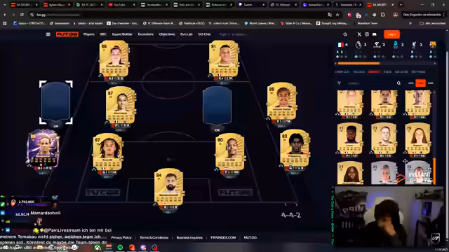 04:51:35Der Stream beginnt mit der detaillierten Planung eines neuen Teams. Der Fokus liegt auf der Zusammenstellung eines französischen Teams mit Spielern wie Pacho, Vitenia und Mondi, wobei die Chemie ein zentrales Kriterium ist. Es wird über mögliche Kombinationen und die Verwendung von Untradable-Karten diskutiert. Der Streamer analysiert seine finanziellen Mittel, die über 300.000 Coins plus weitere durch den Verkauf von Karten auf der Transferliste generiert wurden, und überlegt, wie er das Budget am besten für den Erwerb von Spielern wie Raffinia oder Lamin einsetzen kann, um ein leistungsstarkes Team zu bauen.