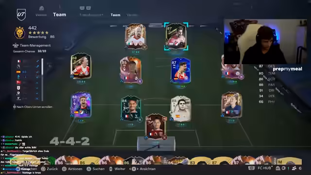 01:49:33Der Streamer diskutiert über die Zusammenstellung seines Teams und die Leistung einzelner Spieler. Er erwähnt, dass er seine 4-1-4-1-Formation aufgegeben hat und nun eine 4-2-3-1-Formation mit drei zentralen Mittelfeldspielern bevorzugt, was ihm mehr Spaß bereitet. Es wird auch über die Schwierigkeiten beim Öffnen von Packs gesprochen, da der Speicherplatz voll ist, was das Grinden von 2x79 Packs verhindert. Spieler wie Pina werden positiv hervorgehoben, während Busquets und Alba kritisch betrachtet werden, da sie als zu langsam empfunden werden und Alba von vielen Gegnern überlaufen wird. Die Diskussion dreht sich auch um die Effektivität bestimmter Spieler und die Frustration über wiederkehrende Bugs im Spiel, wie den Anstoß-Bug und Volley-Bugs nach Ecken, die trotz Patches weiterhin bestehen.