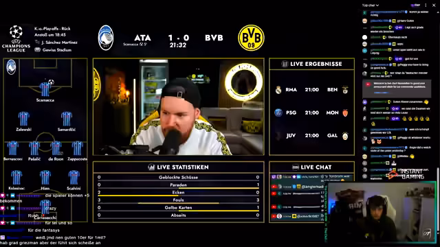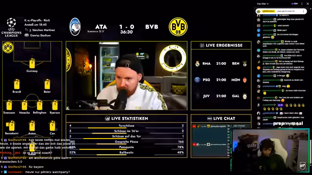 00:11:51Die Aufmerksamkeit verlagert sich auf das Champions-League-Spiel zwischen Borussia Dortmund und Atalanta. Der Streamer analysiert das Spielgeschehen kritisch, besonders die defensive Leistung des BVB. Er äußert seine Enttäuschung über das frühe Gegentor und die mangelnde Zuordnung im Mittelfeld. Er betont die wichtigen Rollen von Spielern wie Emre Can und Julian Brandt und hofft auf ein spannendes Spielverhalten von Borussia Dortmund.