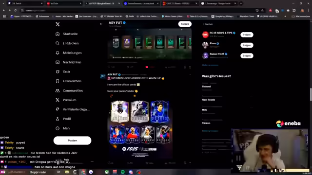 00:24:26Es wird intensiv über die anstehende League-of-TOTS-Reihenfolge in FIFA spekuliert. Die Freude auf besonders erwartete Spieler wie Hakimi, der bisher keine Special Card in dieser Saison hatte, und Ödegard wird deutlich. Der Streamer äußert sich kritisch über den Verkaufsstart eines neuen, kostenpflichtigen Season-Passes mitten im Jahr und gibt Einblicke in seine eigenen Pack-Strategien für die TOTS-Zeit. Die Reihenfolge der Ligen wird als ungewöhnlich empfunden.