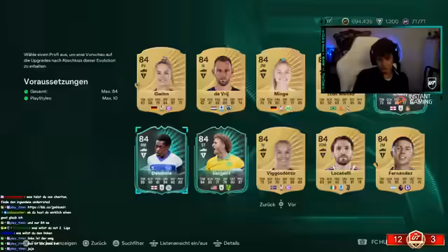 02:15:24Die Konversation dreht sich um die Vorteile spezifischer Playstyles und wie diese am besten auf bestimmte Spieler angewendet werden können. Der Streamer überlegt, ob es sinnvoll ist, 'Schnittstellen-Pass' auf einen ZM anzuwenden oder lieber für neue Evos aufzubewahren. Es wird auch eine Left-Wing-Evo besprochen, die einen Spieler auf 85 hochstufen würde, aber mit geringeren Dribbling- und Passwerten, dafür aber mehr Pace. Die Community gibt Ratschläge zu verschiedenen Evolutionspfaden und der optimalen Nutzung von Spieler-Upgrades. Es wird auch der 'Spukender Stürmer'-Playstyle erwähnt und die Frage, ob bestimmte Spieler, wie der Leipzig-O-Pender, auf dem Markt verfügbar sind. Die Wichtigkeit von Playstyles wie 'Technical Gold' gegenüber 'Finesse in Gold' wird ebenfalls diskutiert, wobei der Streamer eine Präferenz für 'Technical Gold' äußert.