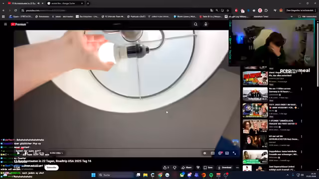 01:48:10Die Inhaltswährung des Streams erfolgt mit dem Wechsel auf den YouTube-Kanal von 'Marks Reisekanal', nachdem zuvor ein anderer Kanal angesehen wurde. Das Hauptthema wird aber bald vom Content-Wechsel abgelenkt, da der Streamer erneut auf das Problem mit den Lichtschaltern im Raum stößt. Er beschreibt den Prozess, die Lampen auszuschalten, als anstrengenden 'Krampf' und findet schließlich eine Lösung, indem er den Stecker der Steckdose zieht.