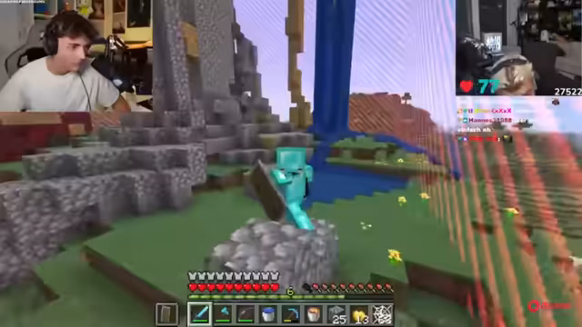 01:28:36Das erste ernste PvP-Gefecht mit einem Gegner findet in einer Höhle statt. Der Streamer und sein Partner kämpfen sich langsam durch enge Gänge, wobei sie auf gefährliche Mobs wie Zombies achten müssen, die überproportional viel Schaden verursachen. Das 'Friendly Fire' ist ausgeschaltet, was die Kämpfe taktisch präziser macht. Sie sammeln Eisen, um eine komplette Eisenrüstung herzustellen, und treffen auf einen Kettenpanzer-Gegner, was den Kampf intensiviert.