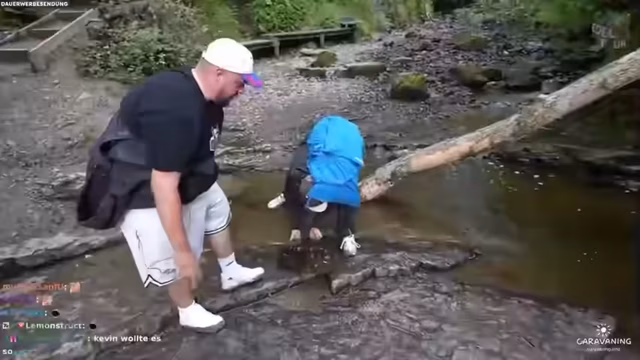 06:18:19Nach dem erfolgreichen Drohnenflug bereitet sich die Gruppe darauf vor, im Wasserfall schwimmen zu gehen. Es wird diskutiert, wie kalt das Wasser sein könnte und ob es sicher ist. Die Temperatur wird auf etwa 19 Grad Celsius geschätzt, was als „ultra schwül“ empfunden wird, da es den ganzen Tag geregnet hat. Es wird kurz über die Anwesenheit von Blutegeln im Wasser spekuliert, was jedoch schnell als unwahrscheinlich abgetan wird. Die Gruppe entscheidet sich, ihre Unterhosen auszuziehen, um nach dem Schwimmen trockene Kleidung zu haben, da keine Kinder in der Nähe sind. Diese Entscheidung wird als praktisch und „schlauer“ angesehen, um nasse Kleidung auf dem Rückweg zu vermeiden. Die Stimmung ist ausgelassen und humorvoll, während sich die Streamer auf das kalte Wasser vorbereiten.