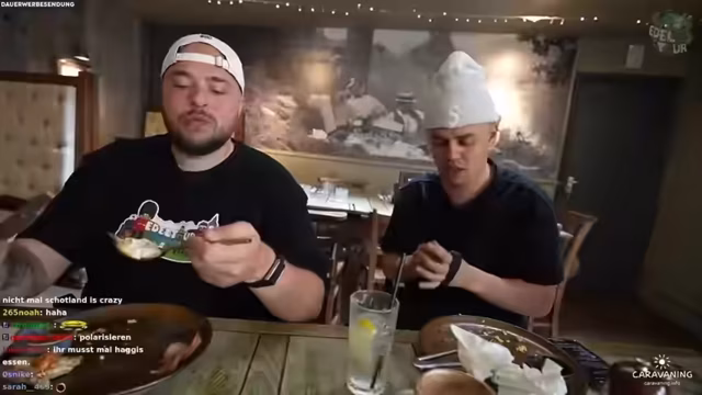 00:48:13Die Streamer genießen ihr erstes englisches Frühstück der Tour und zeigen sich begeistert von der Qualität des Essens. Besonders die vegetarische Wurst-Alternative und die Baked Beans werden positiv hervorgehoben. Es wird festgestellt, dass der englische Bacon dicker und weniger knusprig ist als der in Deutschland übliche. Eine ausführliche Diskussion entsteht über die 'Brown Sauce', einen klassischen englischen Dip, dessen genaue Zusammensetzung unbekannt ist, aber als Mischung aus Barbecue-Soße und Essig beschrieben wird. Die Streamer probieren die Soße und vergleichen sie mit anderen körnigen Lebensmitteln wie grobkörnigem Senf oder Hüttenkäse. Die allgemeine Stimmung im Lokal wird als sehr gemütlich und freundlich beschrieben, was die Streamer dazu veranlasst, sich Sorgen um die Zukunft des Geschäfts zu machen, da es trotz der guten Atmosphäre oft leer ist. Sie hoffen, dass das angeschlossene Hotel dem Lokal hilft, wirtschaftlich stabil zu bleiben.