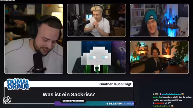 03:07:42Nachdem technische Schwierigkeiten mit der Kamera und dem Mikrofon behoben wurden, beginnt die dritte Folge von 'Dumm drauf'. Dominik begrüßt die Teilnehmer Kevin, Nick, Basti und Herrn Bergmann und leitet das Spiel ein. Er erklärt erneut die Regeln: Fragen zu speziellen Begriffen aus der Community müssen erraten werden, wobei kreatives und um die Ecke denkendes Vorgehen gefragt ist. Die erste Frage lautet: 'Was ist ein Sackriss?' Die Teilnehmer beginnen sofort mit verschiedenen Theorien, die von einem physischen Sack, der reißt, über Staubsaugerbeutel bis hin zu maritimen Szenarien reichen. Die Diskussion ist lebhaft und humorvoll, wobei jeder versucht, die Bedeutung des Begriffs zu entschlüsseln.