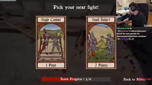 03:25:41Der Streamer beginnt ein Spiel namens 'Halfsword' und erklärt die grundlegenden Mechaniken. Das Ziel ist, in einem Kampf-Modus den Rang zu steigern, bei dem man bei jedem Tod den gesamten Fortschritt verliert. Er startet einen sogenannten 'Hardcore-Run', um die Herausforderung zu erhöhen. Nach einigen Siegen kommt es zu einem kritischen Moment, bei dem sein Charakter fast stirbt. Durch eine geschickte Taktik, die Aufgabe zu geben, verliert er nur einen Rangpunkt anstatt des gesamten Fortschritts und rettet seinen Run knapp.