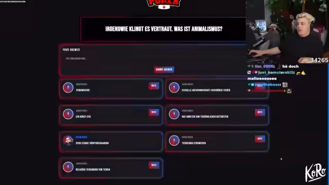 02:44:57Der Streamer interagiert kontinuierlich mit den Teilnehmern während des Spiels, gibt Hinweise und kommentiert die Eingaben. Bei einer Frage zu Schnecken beim Liebesspiel kommt es zu humorvollen und obszönen Antworten, was das spielerische und lockere Klima unterstreicht. Der Fortschritt der Quizshow ist geprägt von schnellen Fragen, schnellen Antworten und einem dynamischen Wechsel zwischen dem Aufdecken der Antworten, dem Voten und der Bekanntgabe der Punktestände, was für hohen Unterhaltungswert sorgt.