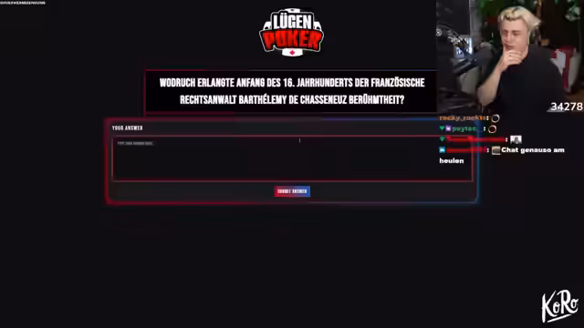 03:25:40Bei der Frage nach dem Ruhm des französischen Anwalts im 16. Jahrhundert haben die Teilnehmer offensichtlich große Schwierigkeiten. Es werden historisch fragwürdige oder völlig abwegige Antworten wie 'Tod' oder 'Er tötete' eingegeben. Der Streamer selbst ist ratlos und appelliert an den Chat, da die Frage aus dem historischen Kontext kaum zu beantworten ist. Dies führt zu einer der schwierigsten Runden des Streams, bei der selbst die vorgeschlagenen Antwortmöglichkeiten sehr spezifisch und ungewöhnlich sind.