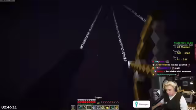 03:37:40Bei der Nether-Exploration stoßen die Spieler auf einen Ghast. Ein Versuch, ihn aus der Distanz mit einem Pfeil zu eliminieren, scheitert, was zu einem hektischen Moment wird. Nachdem der Ghast näher kommt, wird er erfolgreich mit der Angel getötet. Der Streamer kommentiert die Situation mit 'Halber Herzinfarkt', was die Anspannung unterstreicht. Trotz der Gefahr wird der Ghast bezwungen und das duo reist weiter, um Enderperlen zu farmen und das Inventar zu leeren.