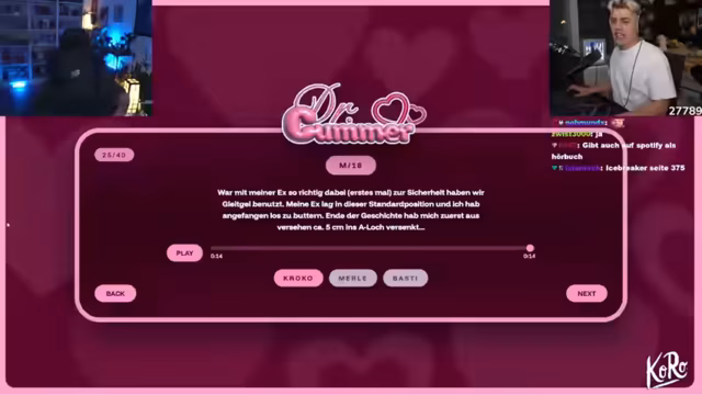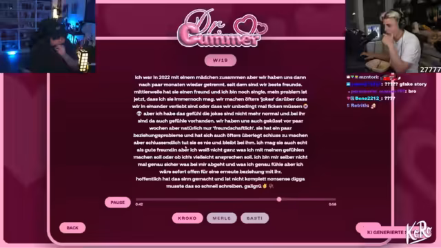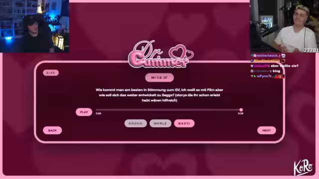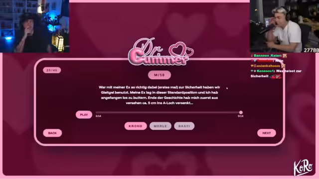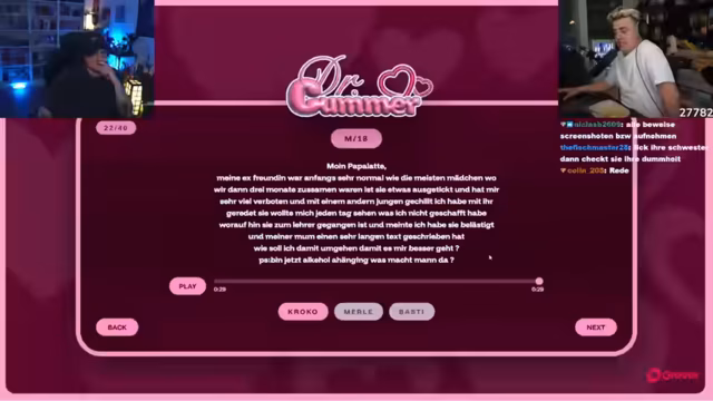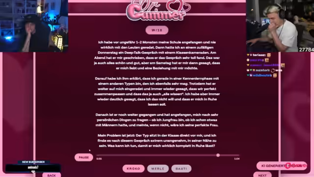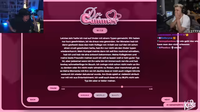 02:31:54Es wird angekündigt, dass der Streamer und Nic gemeinsam Dating-Probleme der Community lösen werden. Der Streamer äußert Zweifel an ihrem Erfolg, ist aber zuversichtlich, dass sie es irgendwie hinbekommen werden. Er erwähnt, dass Kenny und Robin eine Website für die Show erstellt haben, die einige lustige Elemente enthält. Der Streamer geht kurz auf die Toilette, bevor die Show beginnt. Er erzählt, dass er Silksong gespielt hat und versucht, 100% im Spiel zu erreichen. Der Streamer fragt sich, ob es krank ist, wenn er sich in der Hose richtet, nachdem er auf der Toilette war. Er scherzt darüber, dass Nic ihm auf seinen Pimmel geguckt hat. Der Streamer macht die Website für die Show auf und erwähnt, dass sie Dr. Kammer heißt. Er erzählt von einem TikTok, in dem er von Sam Westwild zurückkommt und dass er vorhat, 5 Kilo abzunehmen. Der Streamer und Nic begrüßen die Zuschauer und kündigen an, dass sie Probleme aus der Community lösen werden. Sie werden abwechselnd die Fälle vorlesen und kommentieren.