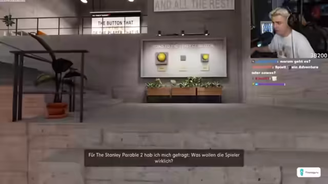 02:05:11Der Streamer beginnt das Spiel 'The Stanley Parable Ultra Deluxe', eine Erweiterung des Originalspiels von 2013. Er ist begeistert vom Spiel und beschreibt es als eines der besten, die er je gespielt hat. Das Ziel ist, verschiedene Enden zu finden und gleichzeitig neue Inhalte zu erkunden. Er interagiert intensiv mit dem Chat und lässt sich von den Spielmechaniken überraschen.
