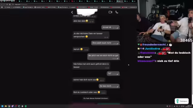 05:40:50Der Stream beginnt mit der Reaktion auf Tinder-Chats von Zuschauern. Der Streamer, Nico und Krokobor kommentieren verschiedene Nachrichten und Gesprächsverläufe. Es werden verschiedene奇怪的 und ungewöhnliche Chat-Anfänge analysiert, darunter auch sensible Themen wie Altersunterschiede und unangemessene Bemerkungen. Die Teilnehmer diskutieren über erfolgreiche und gescheiterte Ansätze beim Online-Dating und teilen persönliche Erfahrungen.