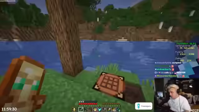 03:56:38Die Situation im Turnier ist knapp, da Teammitglieder wie Heiko und Stegi kurz vor Schluss noch aufholen. Trotz des potenziellen Sieges verfolgt der Streamer weiterhin das Ziel eines Highscores. Er baut einen Beacon aus Froglights und beginnt, aktiv nach spezifischen Nahrungsmitteln und Ressourcen wie Amadillo-Schuppen und Hasenfleisch zu suchen, um verbleibende Achievements abzuschließen. Der Fokus liegt auf effizientem Farmen und Tauschhandel mit Dorfbewohnern.
