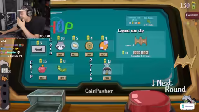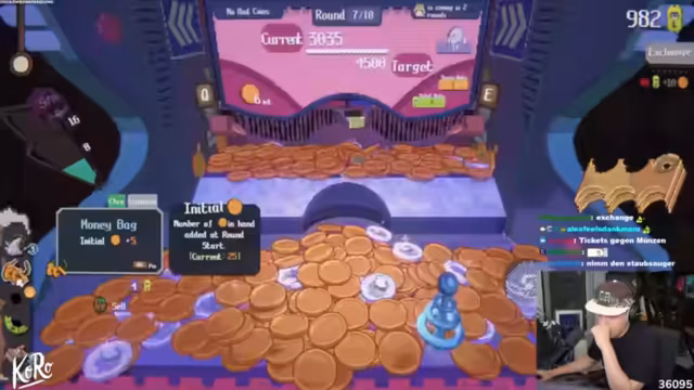 01:26:40Der Streamer beginnt mit einem Glücksspielautomaten, bei dem Münzen in eine Maschine geschoben werden, um Punkte zu sammeln. Er stellt fest, dass die Münzen je nach Position anders rutschen und erzielen Punkte, sobald sie in eine Zielzone fallen. Der Fokus liegt auf dem Sammeln von 'Tickets', der In-Game-Währung, sowie dem Erreichen einer 'Zielpunktzahl' pro Runde, um den Shop zu freischalten und Upgrades zu erwerben.
