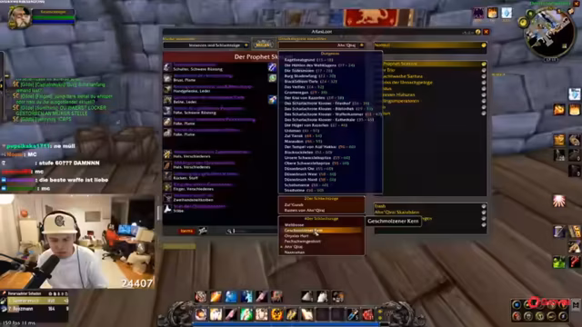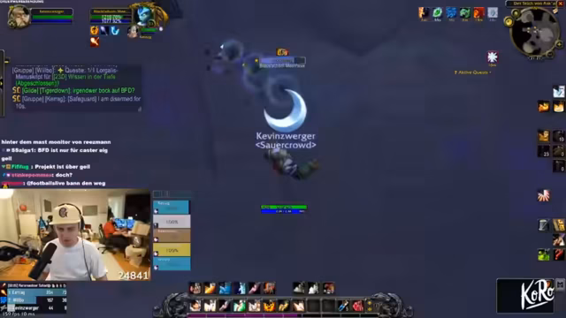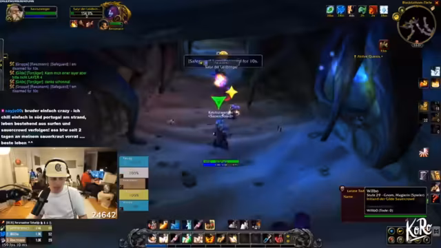 01:44:34Die Gruppe nutzt ihren Überlevel-Vorteil für einfache Quests. Sie plant Dungeons: Kloster (Scarlet Monastery) für Level 30 und Schloss Bums (wahrscheinlich Shadowfang Keep). Ein Spieler erwähnt humorvoll einen imaginären "Buttplug" als Quest-Reward. Diskussionen über Makro-Limitationen und Cast Sequences folgen.