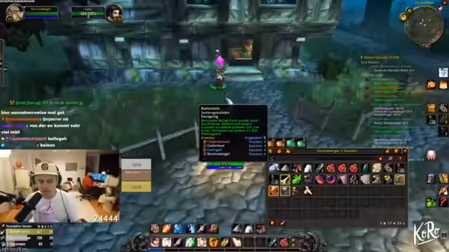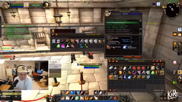 12:49:26Nach Quest-Abgaben in Booty Bay erhält das Team neue Ausrüstung (Handschuhe, Umhänge, Stäbe). Sie diskutieren Stat-Optimierung: Intelligenz für Mana-Pool vs. Ausdauer für Überleben im Hardcore-Modus. Ein Spieler erwähnt, dass sein Charakter jetzt „fresh“ aussieht. Das Team plant den Verkauf von Items, um Gold für Zauber und Mounts zu beschaffen.