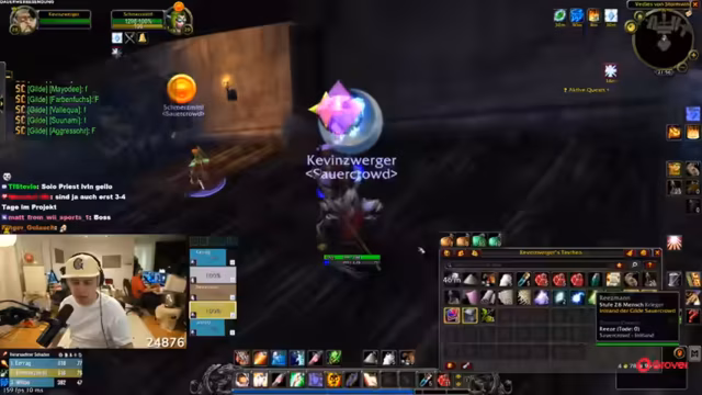 11:04:46Ein Spieler erklärt wichtige Addons für WoW, darunter Hinweise auf Gefahren, Dungeon-Loot und Quest-Tracking. Die Gruppe diskutiert die Einrichtung einer Gildenbank, inklusive Rezepttausch und Goldverwaltung. Logistische Herausforderungen wie Taschenbedarf und Charakterlevel für die Bank werden gelöst, wobei betont wird, dass die Gilde gemeinsam aufgebaut werden soll.