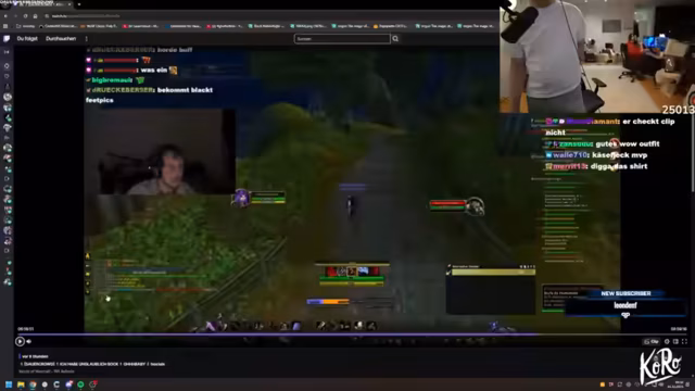 07:29:00Der Kampf gegen Hogger beginnt unter heftigem Alkoholeinfluss. Die Gruppe kämpft unbekleidet mit Fäusten, während Heilungszauber aufgrund von technischen Einschränkungen ausbleiben. Es kommt zu massiven Schadensphasen und verbalen Auseinandersetzungen mit anderen Spielern. Parallel dazu wird die Ankündigung eines bevorstehenden Dungeons (Blackfathom Deep) gemacht, für den zusätzliche Vorbereitungen nötig sind.