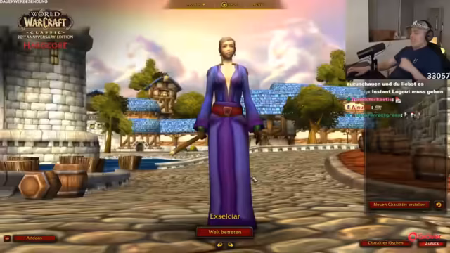 00:33:37Der Stream setzt nun offiziell in World of Warcraft ein. Der Streamer wählt einen Magier als Charakterklasse für den Hardcore-Modus, bei dem ein Tod des Charakters zum sofortigen Spielende führt. Er beginnt im Startgebiet von Stormwind als Level-1-Charakter und startet die ersten Quests. Der Stream betont eine gemütliche Atmosphäre, in der neben dem Gameplay auch mit dem Chat geredet wird.