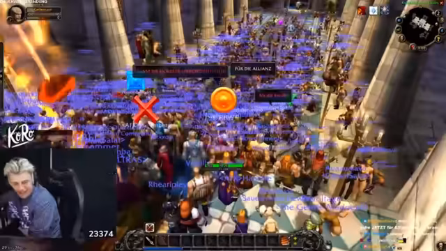 02:13:45Nach der finalen Entscheidung für die Allianz und der Abstimmung im Discord marschiert der Streamer mit einem Großteil der Teilnehmer in der Spielwelt von World of Warcraft ein. Es kommt zu technischen Problemen, da sich die Teilnehmer über verschiedene verteilen. Trotzdem gelingt es, einen Großteil der Spieler in der Kathedrale des Lichts, der Startstadt der Allianz, zu versammeln. Er rät allen Spielern, die Ingame-Musik einzuschalten, um die Atmosphäre des Events voll zu genießen.