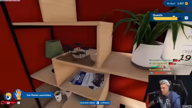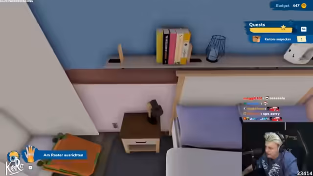 08:02:03Der Streamer befindet sich nun in einem völlig neuen Szenario: an der Ostsee, wo er eine Buchhandlung und eine Kaffeestube für ein Paar einrichten soll. Er wechselt vom spielerischen Modus in einen ernsteren Arbeitsmodus und räumt auf. Dabei bittet er seinen Freund, die Stimmung nicht negativ zu gestalten. Die Aufgabe ist komplex, da neue Möbel gekauft und Wände gestrichen werden müssen. Das Budget ist jedoch knapp, was zu stressigen Entscheidungen führt. Schließlich gelingt es, das Räumchen fertigzustellen, und das Paar ist zufrieden mit dem Ergebnis.