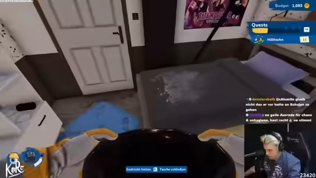 07:08:37Die Hauptaufgabe besteht darin, das völlig chaotische Zimmer von Steffen Jablonski aufzuräumen, damit sein Bruder einziehen kann. Der Zustand des Raums ist dermaßen verworren, dass der Streamer zunächst orientierungslos ist und grundlos nach einem Mikrowellengerät unter dem Bett sucht. Parallel dazu wird die Frage diskutiert, ob man in einer WG leben könnte. Der Streamer lehnt dies ab, insbesondere die Teilung eines Kühlschranks mit einer nicht-partnerischen Person wäre für ihn unvorstellbar. Im Vergleich dazu fühlt sich das Zusammenleben mit seiner Freundin als völlig andere und positive Erfahrung an.