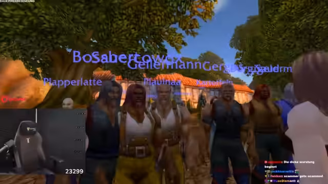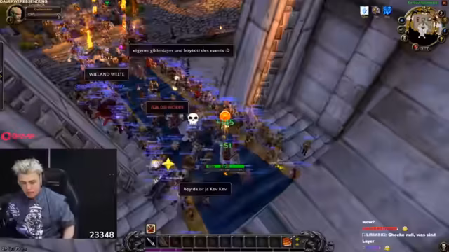 01:49:17Während er in der wartet, trifft der Streamer zufällig einen anderen World of Warcraft-Spieler in der Nähe. Es entwickelt sich eine spontane Konversation, bei der der Streamer seinen Namen 'Papa Platte' erklärt und dem Spieler einen deutschen Schimpfwort 'Du bist ein Hurensohn' beibringt. Das interaktive und ungeplante Treffen unterstreicht den zufälligen und unterhaltsamen Charakter des Streams, während das eigentliche Event noch aussteht.
