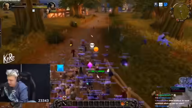 02:48:41Das Live-Stream-Event beginnt mit einem großen Treffen der Community im Spiel. Nach technischen Einladungsproblemen gelingt es, den eingeladenen Gast Jan Hegenberg, bekannt als Snowdoll, in die Gruppe zu holen. Er wird mit einem außergewöhnlichen, von der Jugend der Community inspirierten Auftritt empfangen, bei dem er seine beiden berühmten Lieder 'Horde rennt' und 'Allianz schlägt zurück' performt. Der Streamer lobt diesen Auftakt als absolut perfekt und hebt hervor, dass dies die Zuschauer beeindruckt und das Spiel World of Warcraft in die Twitch-Charts katapultiert hat.