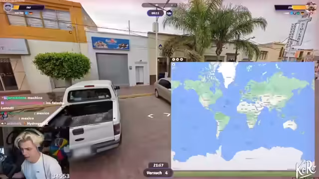 02:03:35Die erste GeoGuessr-Runde beginnt, wobei eine Person sich bewegen darf und die andere nicht. Es wird über Panama, Italien und Thailand geraten. In Kenia wird die B7 als mögliche Straße genannt. Es wird über die Among Us-Sprache in Sri Lanka diskutiert. Nach einem guten Lauf wird das Rad gedreht. Als Handicap kommt 'Zehn Sekunden' hinzu, was bedeutet, dass das Bild nur zehn Sekunden lang sichtbar ist. In der nächsten Runde wird über Mexiko und Russland geraten. Es wird das Rad erneut gedreht, und als nächste Herausforderung kommt 'Verpixelt' hinzu. Es wird gezeigt, wie das Spiel mit dem verpixelten Bild aussieht. Es wird über Jordanien, Frankreich, Rumänien und die Türkei geraten. Als weitere Herausforderung kommt hinzu, dass nur noch im Wasser 'geguesst' werden darf, also nur noch Orte in der Nähe von Seen und Meeren geraten werden dürfen. Es wird über Ruanda, Italien, Deutschland, Indonesien, Jordanien und Frankreich geraten. Als nächste Herausforderung kommt NMPZ (No Move, Pan or Zoom) hinzu, was bedeutet, dass man sich nicht mehr bewegen, drehen oder zoomen darf.