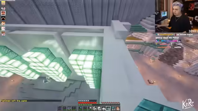 02:18:00Es wird über eine frühere Schnitzeljagd gesprochen, die als „ultra geil“ beschrieben wird. Papaplatte sucht nach Noreax' kleiner Mini-Base und Villagern, die dort angeblich sein sollen, aber die Base wurde abgerissen. Er wird darauf hingewiesen, dass Villager in der ersten Etage eines Flügels zu finden sind. Er äußert sich auch zu Lokis Frisur, die er als „irgendwie ganz cool“ oder „Oma macht was Freches“ beschreibt. Er vergleicht sie mit einem Valoran-Skin und einem Silberschapot, das zu lange einwirkte. Er betont, dass er die Frisur nicht behalten wird, sie aber nicht mehr als „Arsch“ empfindet.