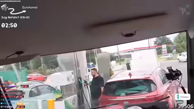 02:22:29Nachdem der Streamer endlich eine freie Tanksäule gefunden hat, stellt sich heraus, dass der Schlauch zu kurz ist, um das Fahrzeug zu erreichen. Der Fahrer des anderen Autos ist am Handy vertieft und bemerkt den Streamer nicht. Der Streamer versucht erfolglos, Aufmerksamkeit zu erregen, und die Situation wird durch die Ankunft weiterer Fahrer kompliziert. Schließlich wird der Tankvorgang unter Zeitdruck doch noch abgeschlossen.