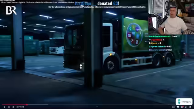00:17:11Aufgrund seines Gesundheitszustands und der eingenommenen Medikamente fühlt sich der Streamer betäubt und entspannt. Der Chat thematisiert seinen Job, wenn er ohne Vorwarnung arbeitslos wäre. Daraufhin spielt er ein Video über einen Müllwerker, dessen tägliche Arbeit er beeindruckend findet. Er geht so weit, dass er selbst der Meinung ist, diesen Job machen zu können und zitiert die Bezahlung und die täglichen Herausforderungen.