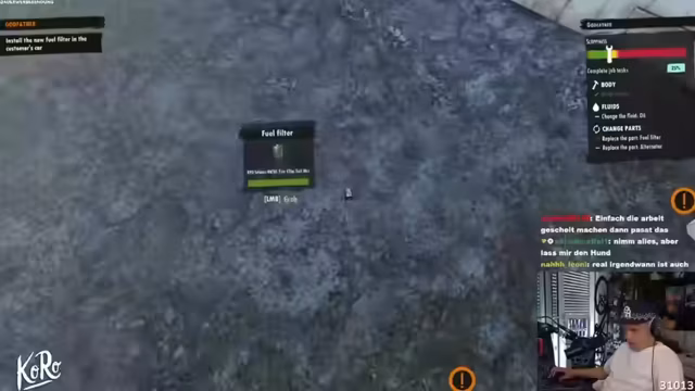 02:11:54Nachdem der Streamer das Spiel neu gestartet hat, fängt er den Reparaturprozess erneut an. Er hat den verlorenen Keilriemen ersetzt und das Auto repariert. Er absolviert weitere Aufträge wie das Wechseln von Reifen, das Nachfüllen von Öl und das Ersetzen des Kraftstofffilters. Er macht sich über die Arbeitsbedingungen in der Werkstatt lustig und überlegt, ob er die Teile recyceln kann.