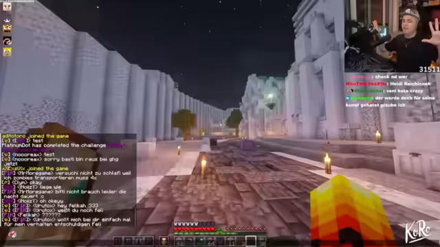 05:10:00Der Streamer beantwortet Fragen zu Spielmechaniken in Minecraft, wie das Ausbreiten von Gras oder das Wachstum von Bäumen, während er versucht, die Bauarbeiten voranzutreiben. Es kommt zu einer humorvollen Diskussion über die Präferenzen des Chats bezüglich Gesprächsthemen, wobei absurde Vorschläge wie 'Sex, Wichsen, Vorhaut, Pimmel' gemacht werden, aber auch ernsthafte Themen wie Cannabis kurz angesprochen werden. Der Streamer lehnt dabei humorvoll ab, Cannabis zu verkaufen, und es wird über mögliche Kooperationen und Geschäftsideen mit anderen Streamern wie Revi gesprochen, die sich um den Verkauf von Feuerzeugen oder Immobilien drehen. Die Interaktion zeigt die lockere und humorvolle Atmosphäre zwischen dem Streamer und seiner Community, während er weiterhin versucht, das 'Dreckding' fertigzustellen.