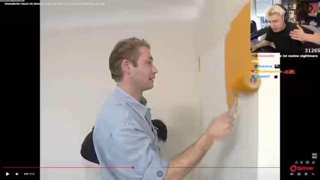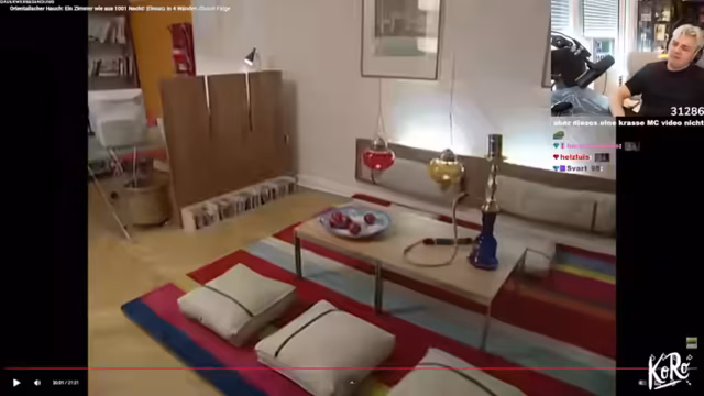 00:31:50Ein Video von 'Einsatz in vier Wänden' mit dem Titel 'Orientalischer Hauch' wird gezeigt, das der Streamer auf Empfehlung eines Freundes ansieht. Er kommentiert humorvoll die erste Szene, in der der Moderator die Stadt Köln vorstellt, und vergleicht dies mit den Reaktionen seiner Zuschauer, die bei ähnlichen Szenen in seinen Streams immer 'Leak' rufen. Die Sendung dreht sich um eine Wohnungsrenovierung, die Tine Wittler in einem orientalischen Stil gestalten soll. Der Streamer äußert seine Skepsis gegenüber der Qualität der Umgestaltung und vermutet, dass es sich um 'Ragebait' handeln könnte. Er ist überrascht von einem Müllschacht in der Wohnung und diskutiert die Vor- und Nachteile solcher Installationen. Die Diskussion über offene Wasserflaschen im Haushalt führt zu einer persönlichen Anekdote über seine Abneigung gegen Gäste, die Flaschen nicht austrinken. Die gezeigte Planung der Umgestaltung mit Sitzkissen auf dem Boden und einem 'fliegenden Teppich' wird kritisch und humorvoll kommentiert, da dies in der Realität unpraktisch sei und der Raum auf der Zeichnung viel größer wirke als in Wirklichkeit.