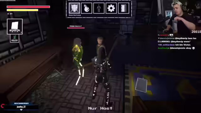 02:23:35Die Streamer suchen nach einem Portal, um sich im Spiel zu vereinen, und finden es schließlich im Inventar. Nach einem kurzen Leak des Verbindungscodes gelingt es ihnen, sich zu verbinden und gemeinsam die Welt zu erkunden. Es wird über ein Tattoo von Kroko diskutiert, das angeblich 'Billigfleisch geht manchmal in Ordnung' bedeutet. Im Spiel sammeln sie grünes Kraut zum Heilen und testen verschiedene Waffen und Ausrüstungsgegenstände. Sie diskutieren über die Skalierung von Waffen mit Stärke und Geschicklichkeit. Es wird auch über Team-Damage gesprochen und getestet, ob er aktiviert ist. Die Streamer bewundern den Grafikstil des Spiels, obwohl sie nur als Strichmännchen dargestellt werden. Sie diskutieren über die Bedeutung von emotionaler Intelligenz (EQ) im Vergleich zum IQ und ob ein IQ-Test wirklich die Intelligenz widerspiegelt. Schließlich treffen sie auf den ersten Boss, der ihnen erhebliche Schäden zufügt. Trotzdem gelingt es ihnen, den Boss zu besiegen und Zugriff zu erhalten. Nach dem Bosskampf füllen sie ihre Heiltränke auf und diskutieren über die Notizen, die andere Spieler im Spiel hinterlassen können.