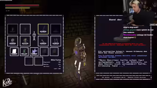 02:34:08Nach dem ersten erfolglosen Bosskampf beginnt eine Phase des Experimentierens und Lösungsfindens, bei der verschiedene Möglichkeiten erkundet werden, um weiterzukommen. Dabei entdecken die Spieler das Inventarsystem und die Möglichkeit, durch bestimmte Aktionen wie 'Erinnern' neue Fähigkeiten freizuschalten. Nachdem ein Schlüssel gefunden wird, gelingt der Zugang zu neuen Bereichen der Spielwelt. In diesen werden neue Waffen und Rüstungen entdeckt, wobei der Streamer besonders von der Optik beeindruckt ist, auch wenn sich die Ausrüstung auf die Beweglichkeit auswirkt, was zu strategischen Überlegungen führt.