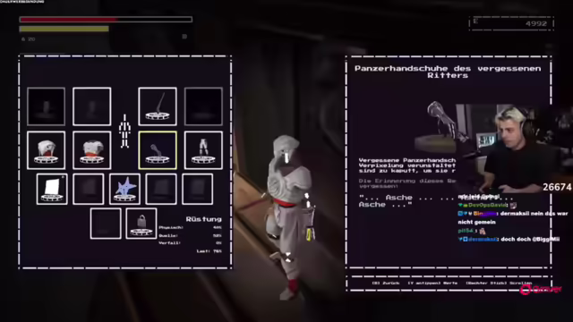 04:05:40Der Streamer vergleicht ein Rüstungsdesign mit World of Warcraft und erwähnt, dass er Marshall dazu gebracht hat, WoW zu spielen. Es wird über das Leveln in WoW gesprochen und Witze darüber gemacht, wie schnell man Level 5 erreichen kann. Danach wird ein Problem im aktuellen Spiel diskutiert, bei dem die Waffe des Streamers verschwunden ist und er sie nicht mehr ausrüsten kann. Verschiedene Lösungsansätze werden ausprobiert. Es wird kurz überlegt, das Spiel neu zu laden, um das Problem zu beheben. Der Chat wird nach Ideen gefragt und es wird überlegt, ob ein Bug vorliegt. Der Streamer interagiert mit dem Chat und geht auf Kommentare ein, während er versucht, das Problem zu lösen. Es wird überlegt, ob man einen Pussy-Modus aktiviert hat und ob man das Spiel neu laden soll.