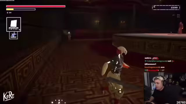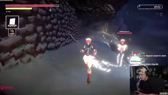 02:43:26Die Streamer sind verwirrt über den weiteren Weg und probieren verschiedene Waffen aus, darunter einen Dolch. Sie suchen nach einem Weg, eine verschlossene Tür zu öffnen, und rätseln über die Bedeutung einer gezackten Klinge in ihren Besitztümern. Nach Gesprächen mit einem NSC finden sie heraus, dass sie die gezackte Klinge benutzen müssen, um das Schlüsselschwert des Mannes zu erwecken. Dadurch erhalten sie den Schlüssel zum Mitarbeiterraum. Sie stellen fest, dass das Schwert jetzt eine spezielle Fähigkeit hat und Ausdauer regeneriert. Trotz des Schlüssels finden sie den richtigen Raum zunächst nicht und sind verwirrt. Schließlich entdecken sie einen versteckten Pfad hinter einem alten Mann und finden heraus, dass sie die L2-Taste benutzen können, um eine spezielle Attacke auszuführen. Sie setzen ihre Reise fort und stoßen auf neue Gegner und Items.