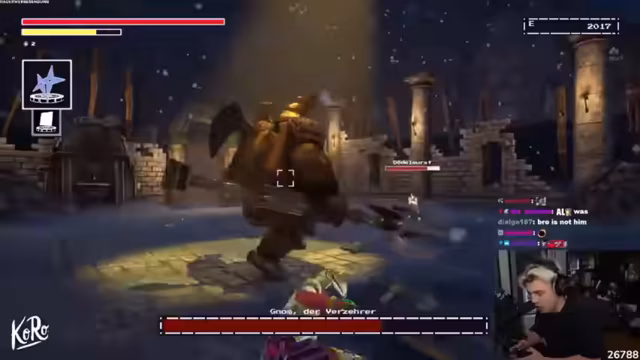 05:59:12Der Streamer befindet sich in einem intensiven Bosskampf, bei dem er ständig die Position des Gegners wechselt und versucht, Schaden zu vermeiden. Er kritisiert die Tanzbewegungen des Bosses und bemerkt, dass dieser ihm Miesbomben zuwirft. Der Streamer kämpft darum, am Leben zu bleiben, während Steine auf ihn herabfallen. Es kommt zu Momenten großer Verzweiflung, als der Streamer knapp dem Tod entgeht. Der Boss scheint sich sogar zu heilen, was den Streamer frustriert. Trotzdem bleibt er kämpferisch und versucht, durch taktische Bewegungen und den Einsatz seiner Fähigkeiten zu überleben. Der Kampf ist geprägt von schnellen Aktionen und knappen Rettungen.