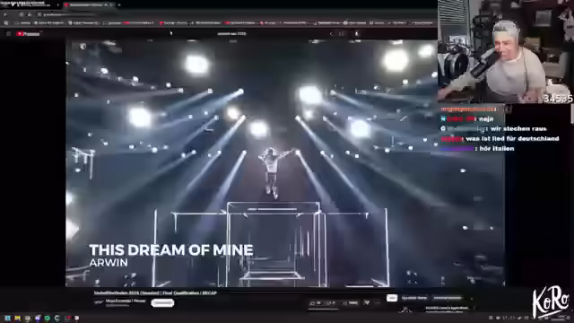 00:32:10Die Kritik am ESC wird fortgesetzt und vertieft. Der Streamer ist der Meinung, dass etablierte deutsche Künstler nicht teilnehmen, weil sie eine Niederlage fürchten und danach gehatet würden. Anschließend präsentiert er internationale ESC-Songs aus Ländern wie Schweden, Österreich und Australien. Er ist von der hohen Qualität und der Professionalität dieser_entries beeindruckt und stellt fest, dass der deutsche Song im Vergleich dazu „gefuckt“ und chancenlos ist.