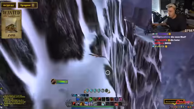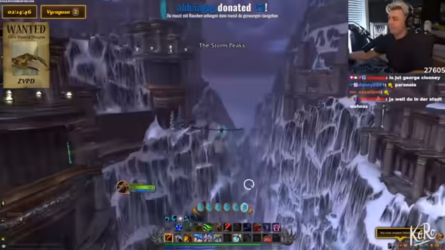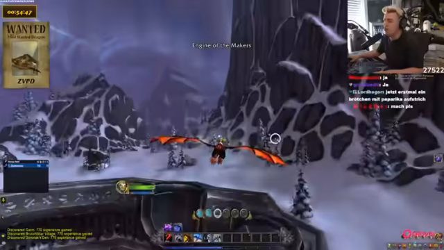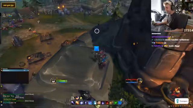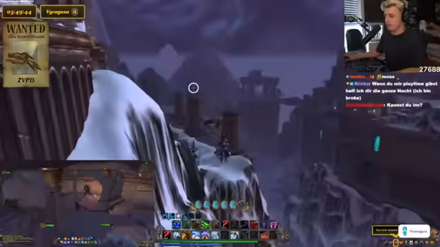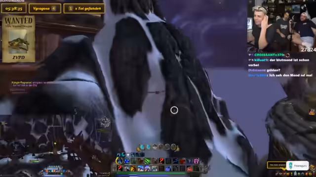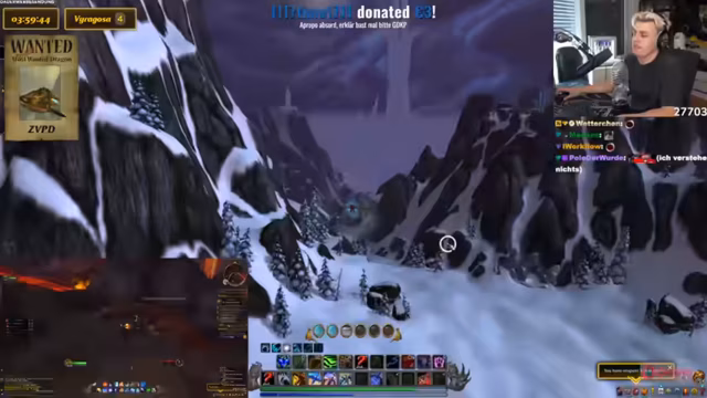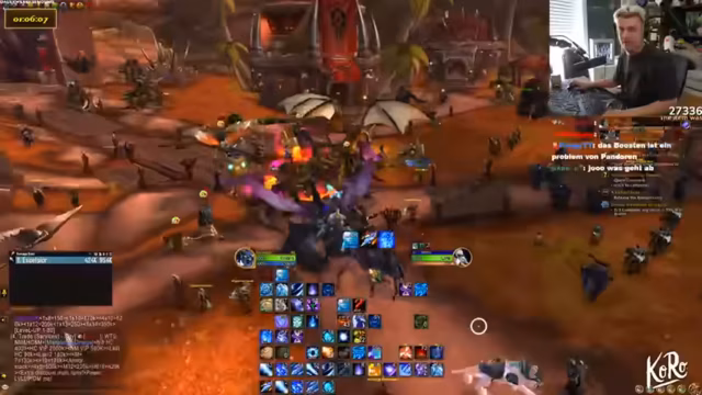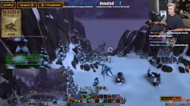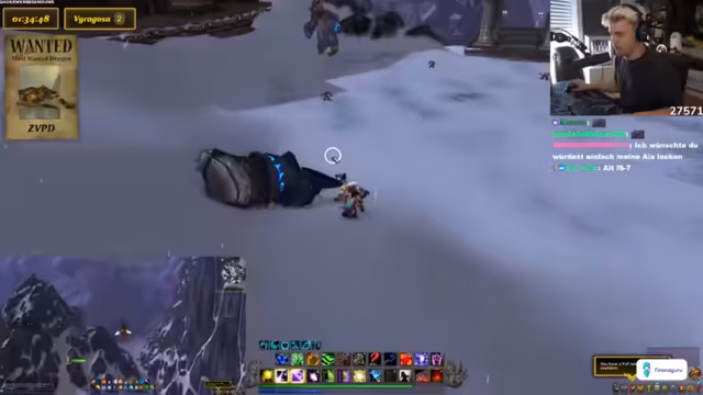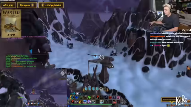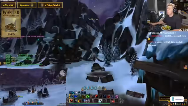 10:23:07Der Streamer vergleicht die Drachensuche mit einem Video von Toni, in dem sie etwas 10.000 Mal sagen mussten. Es wird über ein panda auf dem Shop Mount gesprochen und diskutiert, ob es cool ist, sich Dinge einfach so zu kaufen. Der Streamer erklärt, dass sie ein Addon wie Rare Scanner benutzen, um auf Nummer sicher zu gehen. Er vergleicht die Situation mit einer Familienfeier, auf der ein Onkel Ratschläge gibt, die man ignoriert. Das Makro wird als etwas Ähnliches betrachtet, das man hat, aber nicht wirklich benutzt. Es wird erwähnt, dass man durch das Makro sehen kann, wenn der Drache tot ist. Der Streamer lehnt das Angebot ab, ICC zu machen. Es wird ein Viragoza gesichtet, aber es ist der falsche Rare Mob. Der Streamer fordert die Leute in seiner Gruppe auf, die Server zu wechseln. Es wird über die Schwierigkeit gesprochen, Viragoza herunterzubekommen, wenn er so weit oben ist. Der Streamer sagt, dass er nicht aus dem Ding rausgehen kann, sonst stirbt er instant. Es wird überlegt, warum man den Viragoza nicht mounten kann.