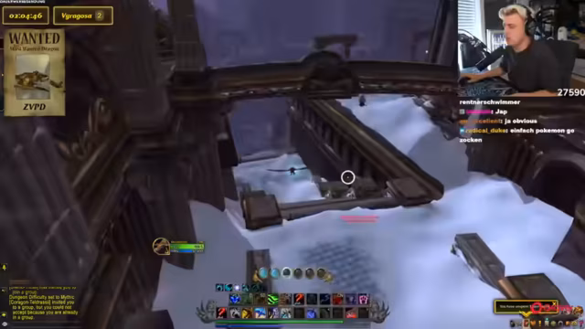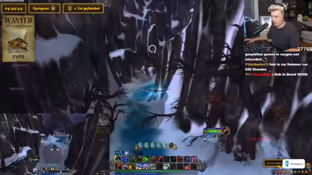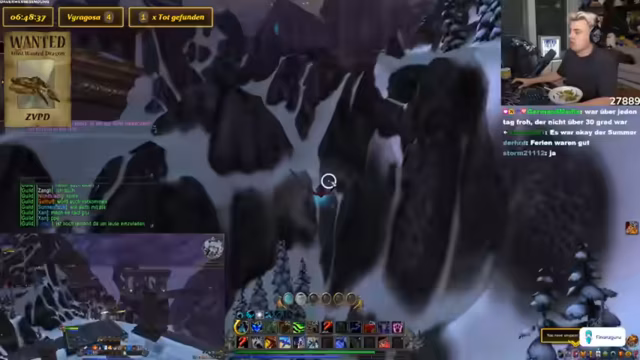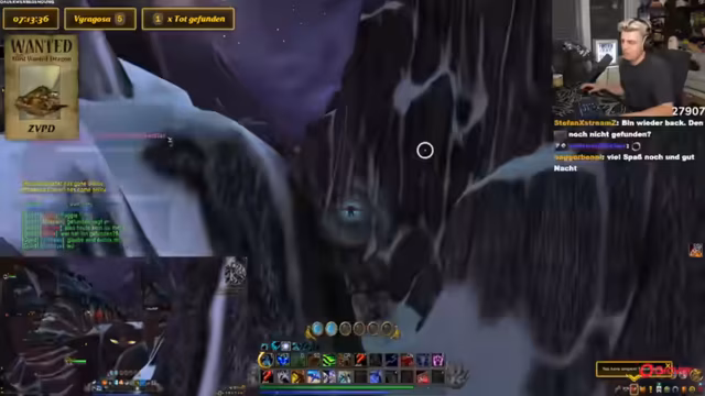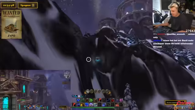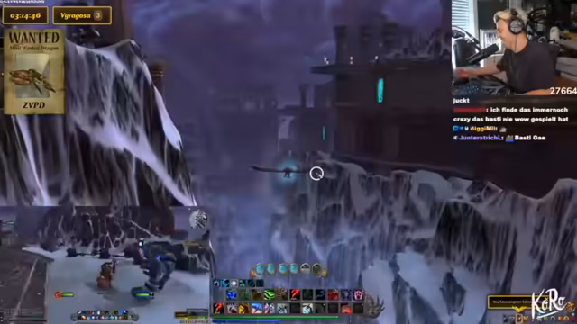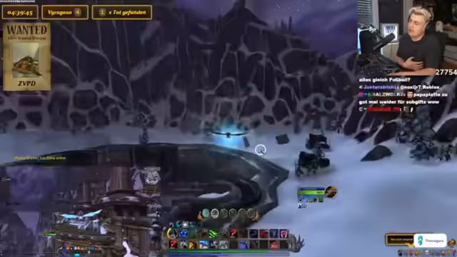 03:02:43Basti hat das Level 40 erreicht und die beiden begeben sich nach Nordend, um den ZVPD zu suchen. Kevin nutzt ein Add-on, das die Flugrouten des Drachen anzeigt. Sie planen, in einem festgelegten Gebiet kreuz und quer zu fliegen, um den Drachen zu finden. Das Warten kann mehrere Stunden dauern, da der Drachen nach dem Tod erst nach 4-10 Stunden respawnt. Die Streamer stellen ihr Interface mit einem Wanted-Overlay für den Drachen ein, um die Suche zu erleichtern und eine akribische Spurensicherung zu betreiben.