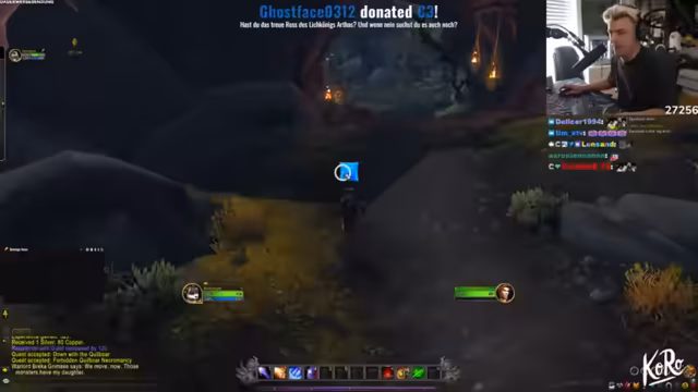 01:26:03Es wird beschlossen, Killclaw the Terrible zu besiegen. Basti nimmt die Quest an und wird auf das Mount des Streamers mitgenommen. Der Bosskampf gegen Mordklaue wird gestartet. Nach dem Sieg wird die Quest abgegeben und Level 10 erreicht. Der erste Dungeon, die Finsterbrecher-Zitadelle, wird gestartet. Es wird ein Intelligenz-Buff gegeben. Der Streamer spielt zum ersten Mal DPS in WoW und nutzt einen Rotation Helper. Es wird überlegt, ob Frost als Spezialisierung gewählt werden soll. Es wird über PvP und das Erreichen von 2k Rating gesprochen. Basti soll alles looten, was glitzert. Der Streamer kauft sich Items. Es wird festgestellt, dass es sich um eine Dreimann-Instanz handelt. Der Streamer erhält einen Dagger und Basti eine Tungsnadel. Es wird festgestellt, dass der Streamer viel Erfahrung im Spiel hat.