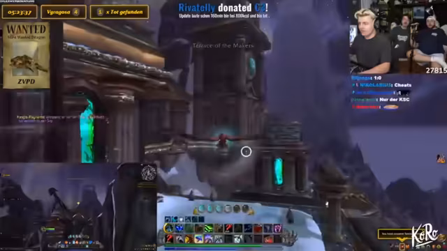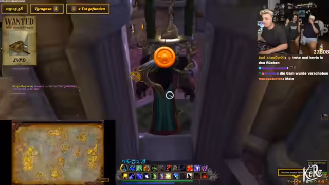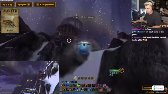 04:13:29Es wird überlegt, den Stream des anderen Spielers einzublenden, um dessen Route zu zeigen. Es wird ein Serverwechsel durchgeführt. Es wird gefragt, ob der grüne Totenkopf ganz oben ist. Es wird ein Witz über die Lieblingspizza der Maka gemacht. Es wird nach dem Drachenspot gefragt und die Route dorthin geplant. Es wird erklärt, wie der Ablauf ist, wenn der Drache gefunden wird: Der Streamer soll ihn kiten, während der andere Spieler sich einloggt. Es wird festgestellt, dass der Streamer den Gegenstand nicht benutzen kann. Es wird diskutiert, ob der Server gewechselt werden muss, wenn Viragosa tot ist. Es wird überlegt, wie man auf einen anderen Server und in eine andere Timeline mit Chromie kommt. Es wird festgestellt, dass sich ein Charakter auf dem Server des anderen Spielers befindet, was die Vorbereitung vereinfacht. Es wird festgestellt, dass der Charakter nackt ist. Es wird versucht, den Charakter zu transferieren, was aber nicht funktioniert. Es wird überlegt, auf welchen Account gewechselt werden soll. Es wird darüber gesprochen, dass der Spawn da oben ist. Es werden Subscriber gegrüßt. Es wird gefragt, ob der tanzende Ork ausgeschaltet werden soll. Es wird festgestellt, dass der andere Spieler den Stream hört. Es wird von den Erfolgen der Tochter in Clash Royale berichtet. Es wird überlegt, ob ein Counter für Viragosa hinzugefügt werden soll. Es wird diskutiert, wie realistisch es ist, den ZVPD zu finden. Es wird vermutet, dass die Spawn-Rate von vier Stunden nicht stimmt und dass die beiden Mobs unterschiedliche Wahrscheinlichkeiten haben.